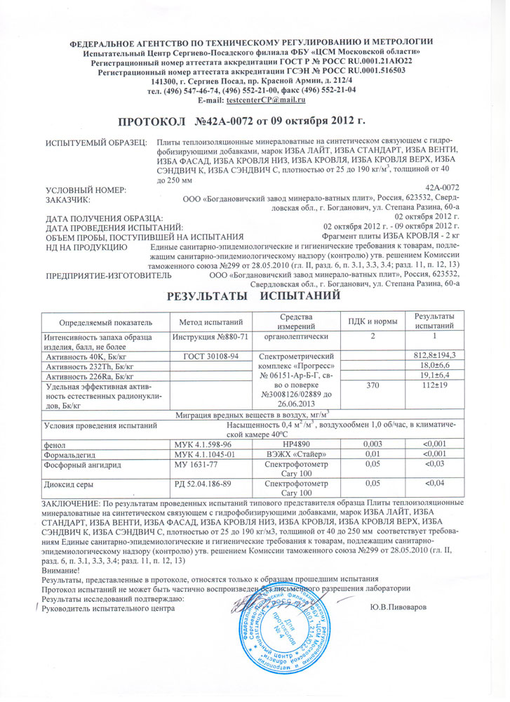 Базальтовая теплоизоляция ИЗБА ООО "Богдановичский завод минерало-ватных плит" (Плиты теплоизоляционные минераловатные на синтетическом связующем с гидрофибизирующем связующем ) Протокол лабораторных испытаний № 42 А -0072 от 09.10.2012г.