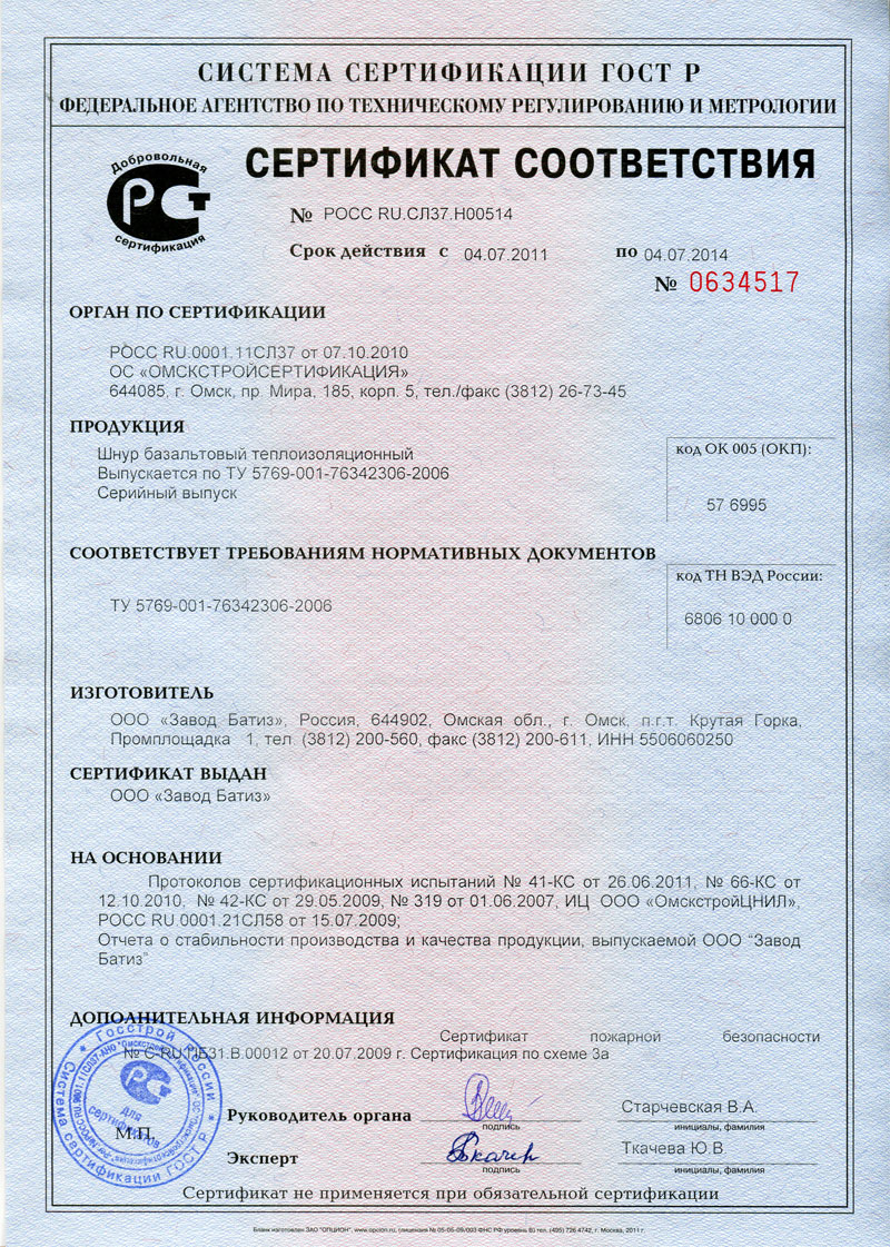 Базальтовая теплоизоляция Батиз -дополнения к разрешительной документации В рамках обновления и дополнения информации в каталоге, справочнике теплоизоляции tutteplo на страницах каталога внесены дополнения в раздел разрешительная документация добавлены протокол радиационных испытаний и сертификат соответствия на шнур базальтовый...