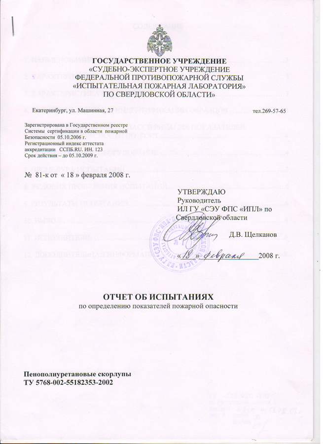 Теплоизоляция из пенополиуретана (завод ТИС) (Пенополиуретановые скорлупы ) Отчет об испытаниях по определению показателей на пожарную опасность № 81-к от 18.02.2008 г. (последняя страница)