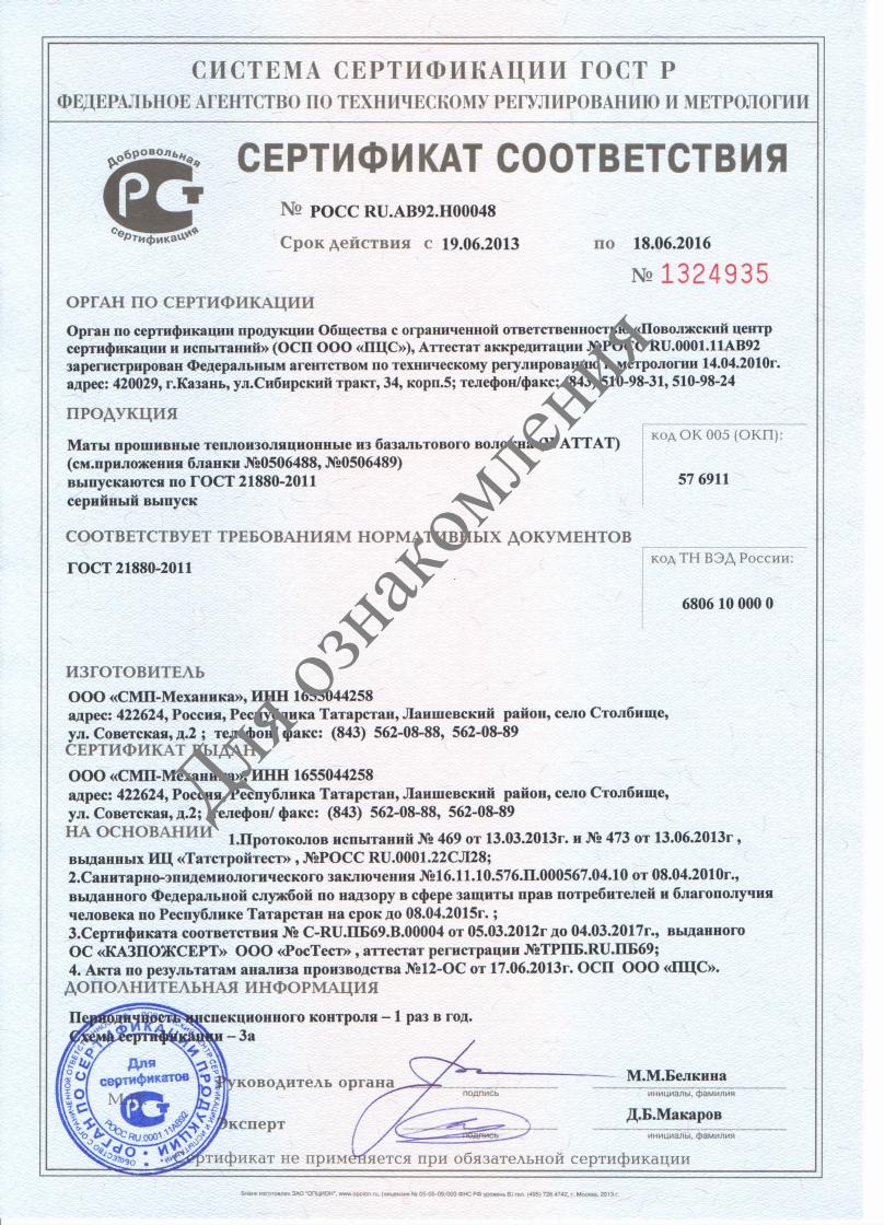 Базальтовая теплоизоляциия WATTAT ООО "СМП-МЕХАНИКА" (Маты прошивные теплоизоляционные из базальтового волокна марки wattat ) Сертификат соответствия № РОСС.RU.АВ92.Н00048 от 19.06.2013г. (стр 1)