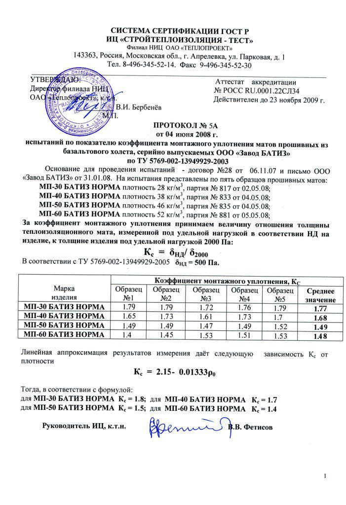 токолы испытания на коэффициент уплотнения для минматов?Жду Вашей